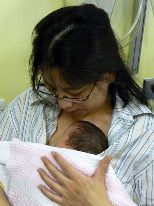 Mummy having a cuddle while Monica has her morning brunch (by tube still).