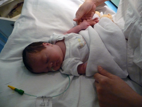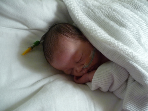Monica has been doing exceptionally well this week.  She now weighs 2.420 Kg (5 lbs 5oz !!!!) which isn't far away from being double her birth weight.  Some of the nurses even joke about her having a double chin and one of them that hadn't seen her since she was admitted from the Queen Charlotte's came over and said "Wow, Monica, you are a little fatty". We know that we are really lucky that Monica is able to tolerate her feeding regime although we are constantly amazed at how the doctors keep putting her 3 hourly quantity up (currently 54ml) every time her weight increases and how she takes it in her stride.  I made the mistake of letting the milk run out half way through a feed and was chastised with a cry that I knew could only mean "do not even think about stopping my food". Sure enough no sooner had the milk-into-tummy syphoning resumed than the look of contentment and calm returned.