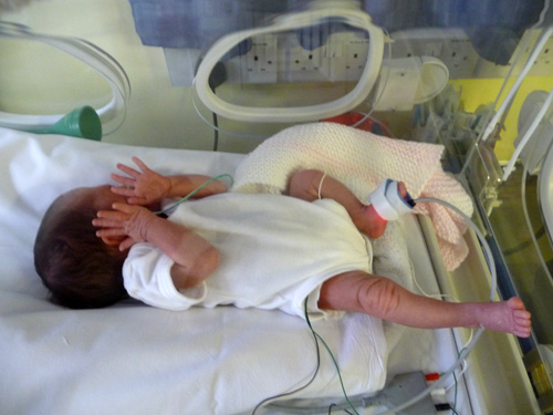They have now started letting her sleep on her back part of the time, although she always seems to manage to wriggle down to the bottom of the incubator. Looking at this photo she is almost unrecognisable from when she was 5 days old. We're so proud of her.